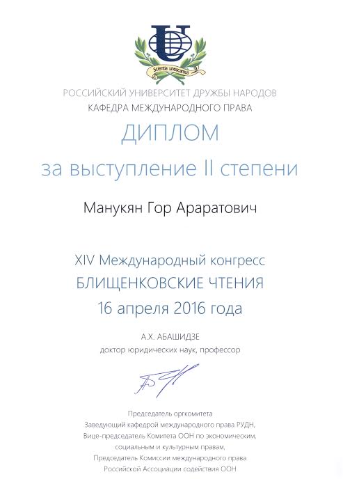 Дипломом 2 степени в секции «Международное экономическое право. Односторонние принудительные меры государств в свете права ВТО» заняла - Игантова Алина Михайловна (студентка 3 курса ЮИ)Дипломом 2 степени в секции «Теория международного права» занял - Манукян Гор Араратович (ассистент кафедры МПВЭД)
