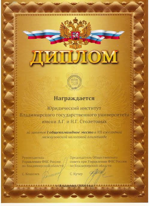 28 апреля в УФНС России по Владимирской области состоялось награждение победителей седьмой межвузовской налоговой олимпиады. Первое место занял студент 3 курса ЮИ (направление «Юриспруденция») Шишов Антон Витальевич.