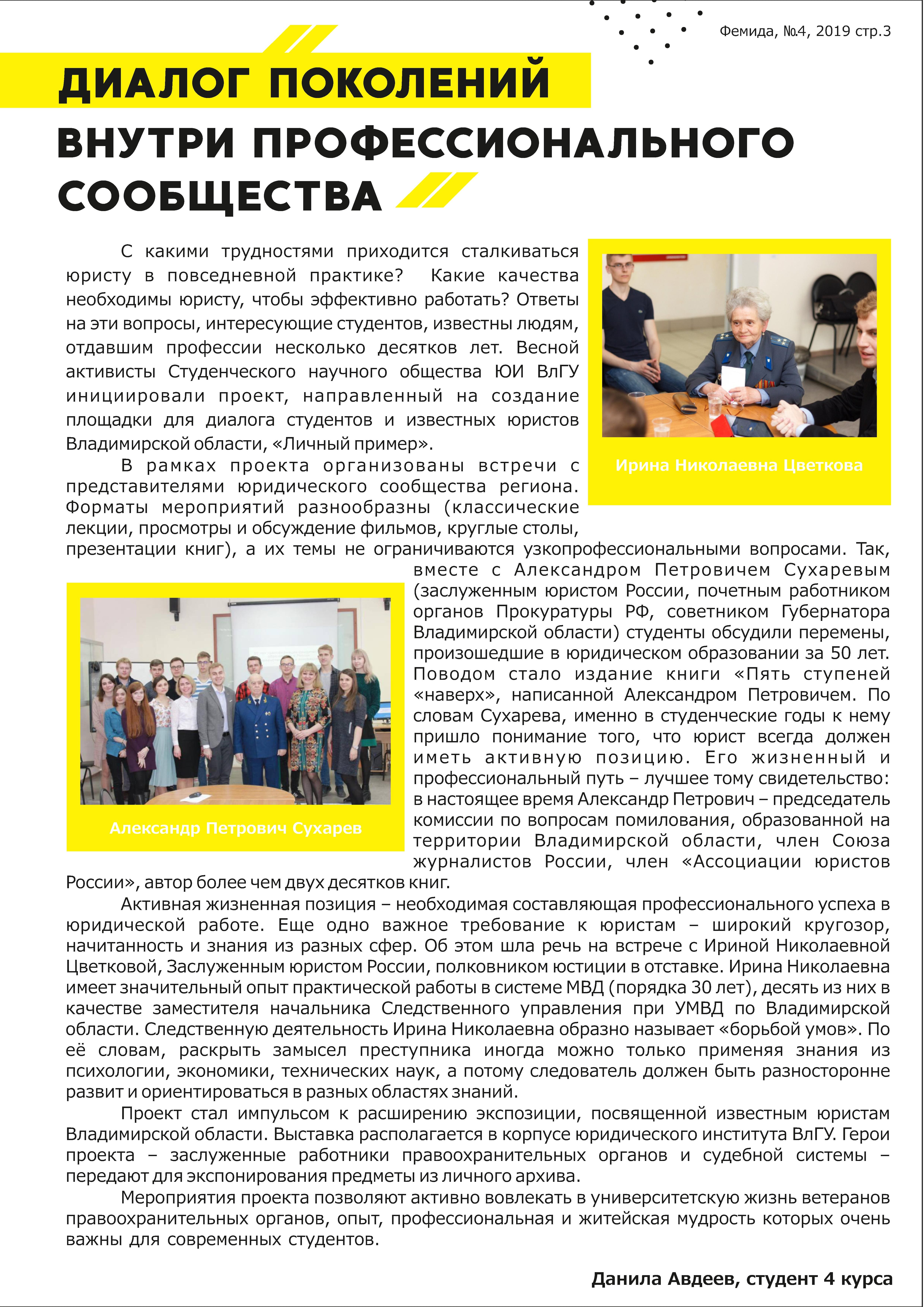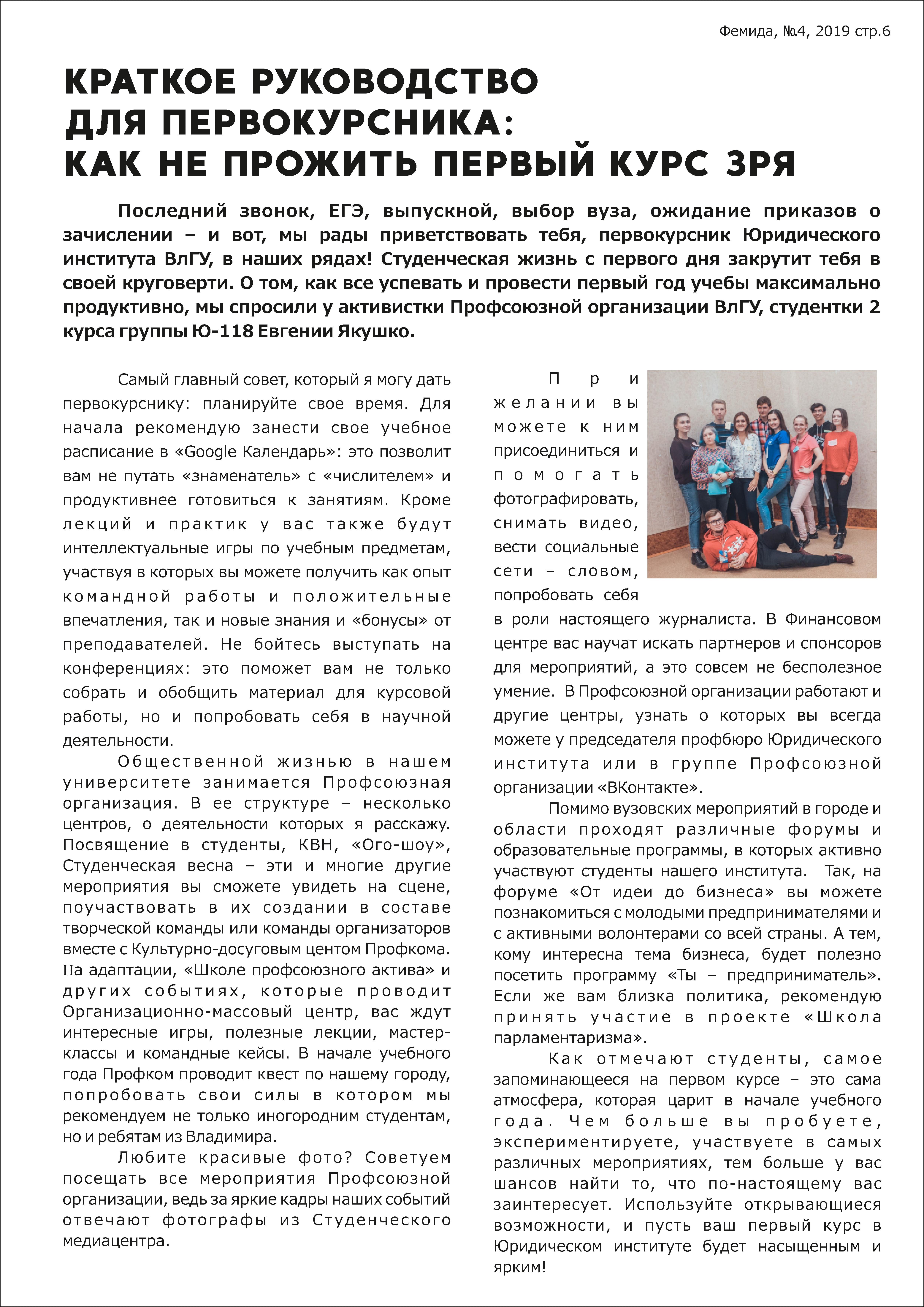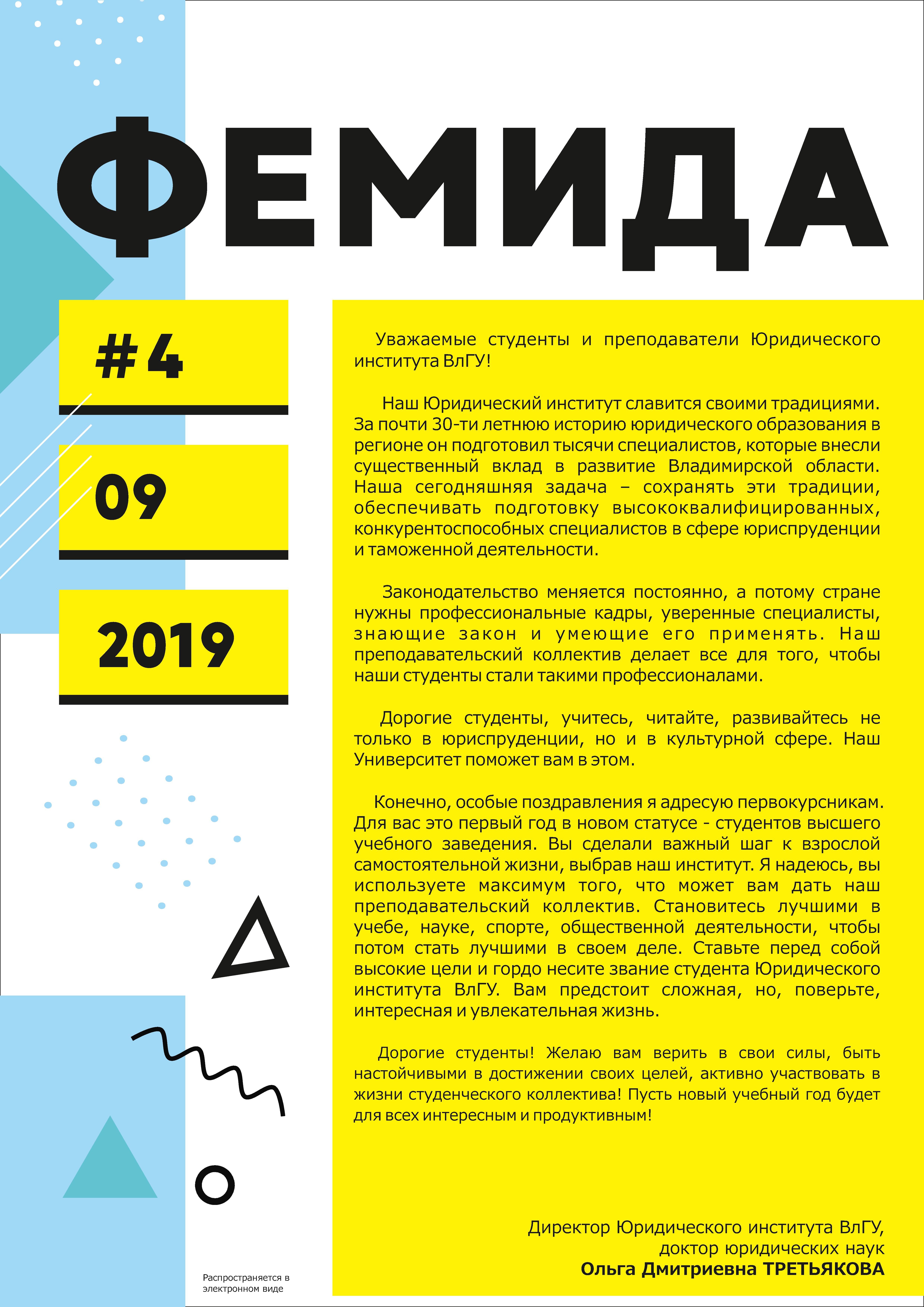 В свет вышел очередной выпуск газеты Юридического института ВлГУ "Фемида". Его подготовили активисты Студенческого научного общества института. Студенты взяли интервью у директора ЮИ Ольги Дмитриевны Третьяковой; рассказали о значимых научных и общественных событиях минувшего лета; поделились советами с первокурсниками.