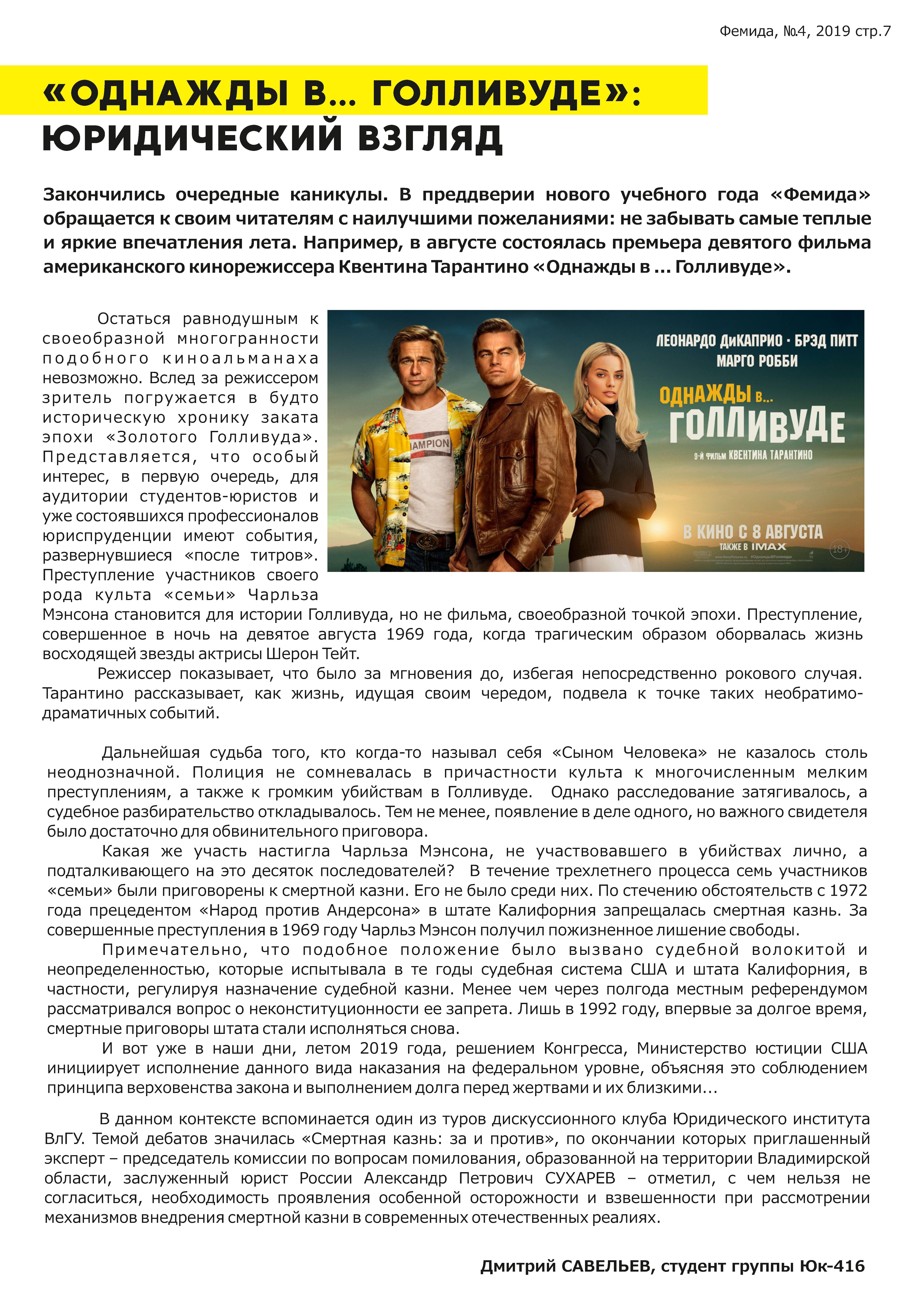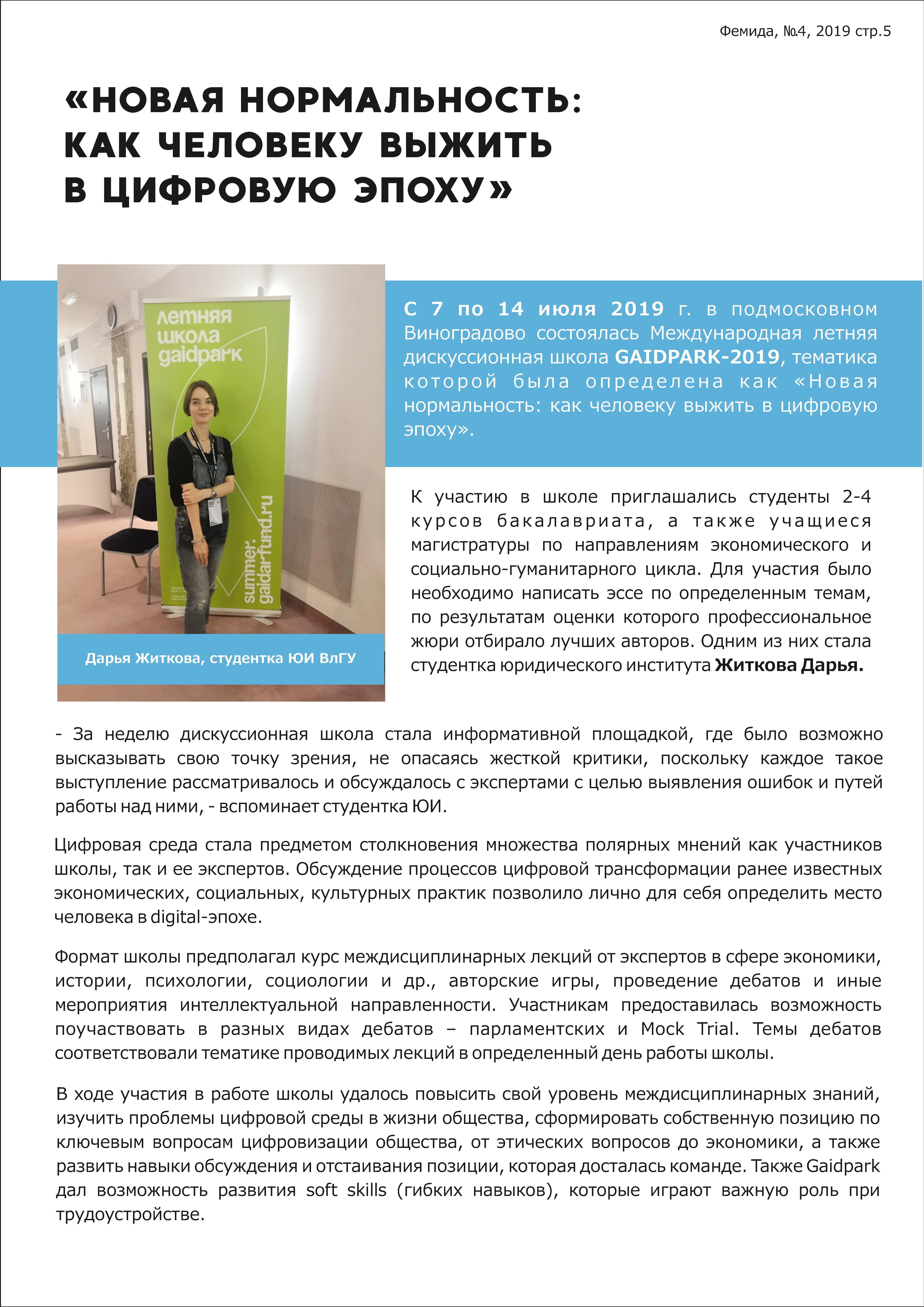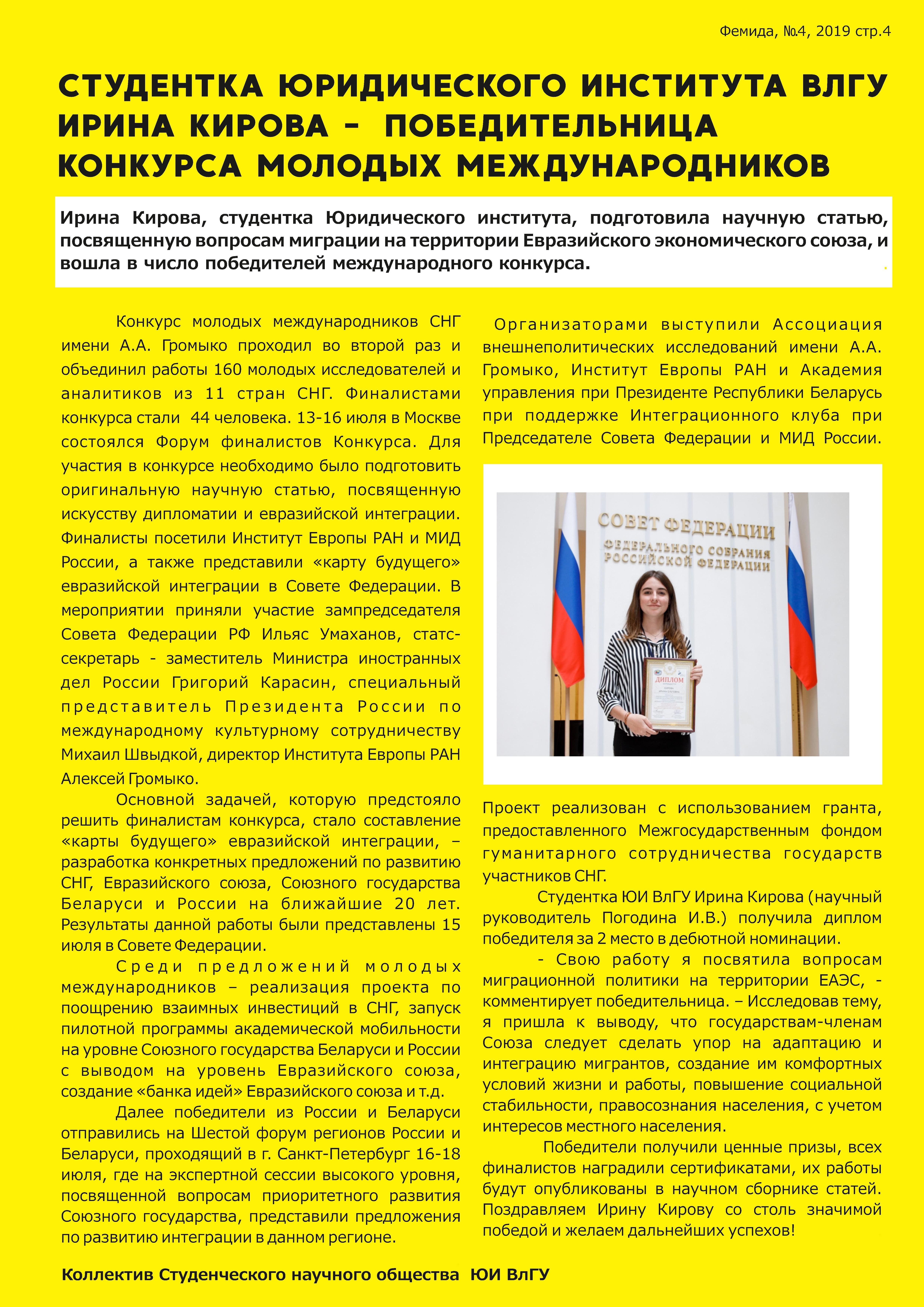 В свет вышел очередной выпуск газеты Юридического института ВлГУ "Фемида". Его подготовили активисты Студенческого научного общества института. Студенты взяли интервью у директора ЮИ Ольги Дмитриевны Третьяковой; рассказали о значимых научных и общественных событиях минувшего лета; поделились советами с первокурсниками.